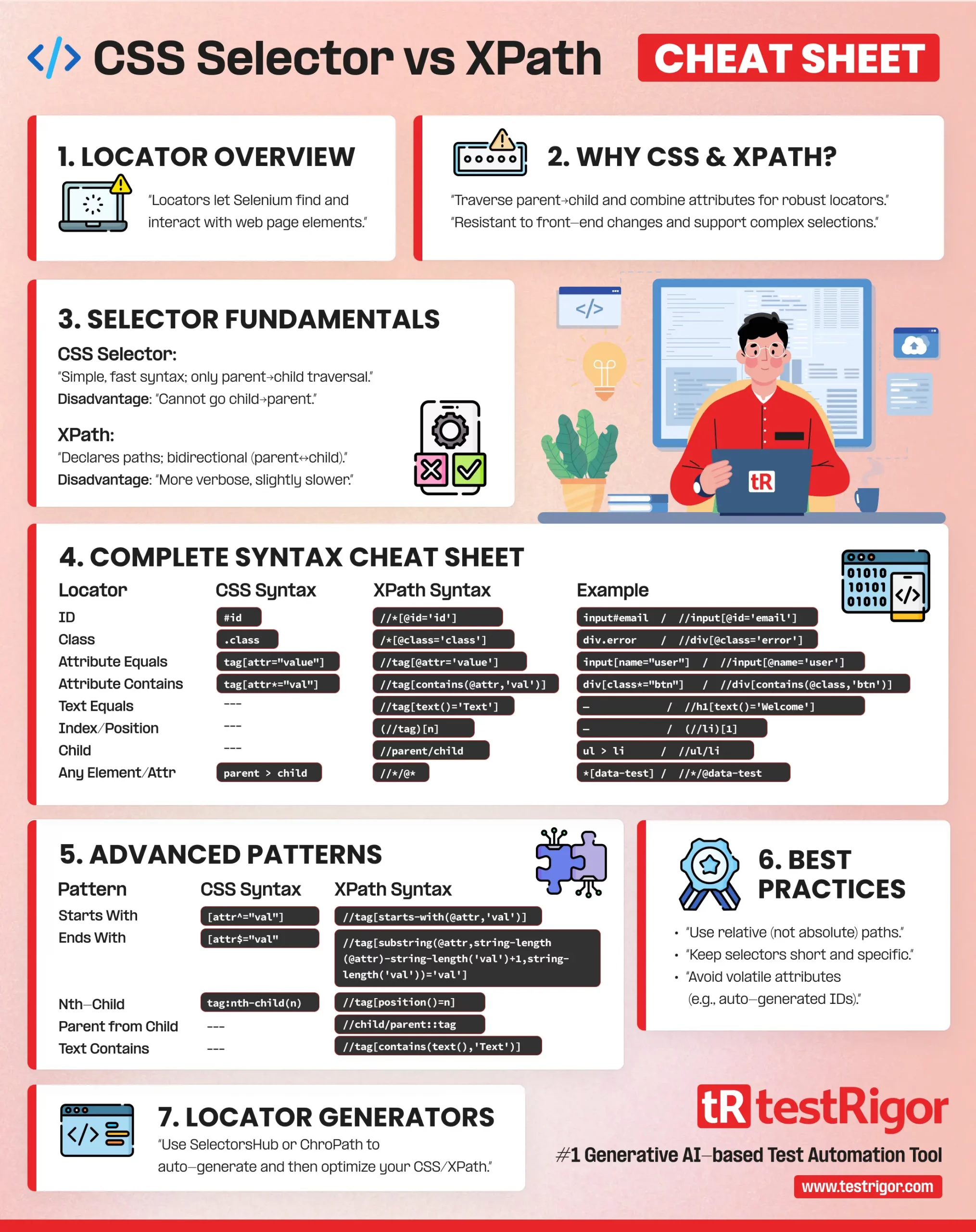 Both SelectorsHub and ChroPath support all major browsers. With the help of browser extensions, you can instantly generate most locator selector expressions. In some cases though, these automatic extensions may generate lengthy locators. We can use the above cheat sheet to optimize such locators.