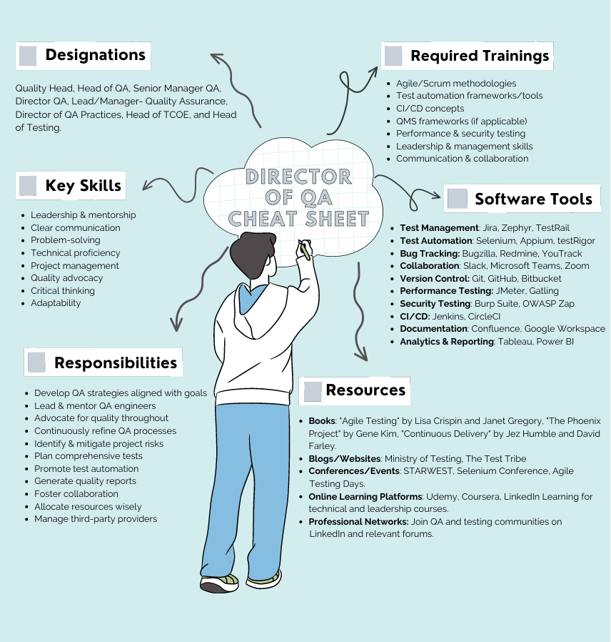 This concise cheat sheet provides a quick overview of the responsibilities, skills, resources, training, and tools essential for excelling in the demanding Director of QA or QA Manager role.
