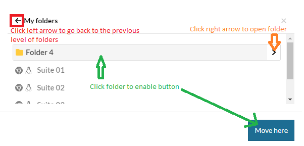 - The popup to move folders allows users to click on the folder or click the right arrow to go into the folder (most helpful when we need to access a nested folder; i.e., a folder inside a folder).