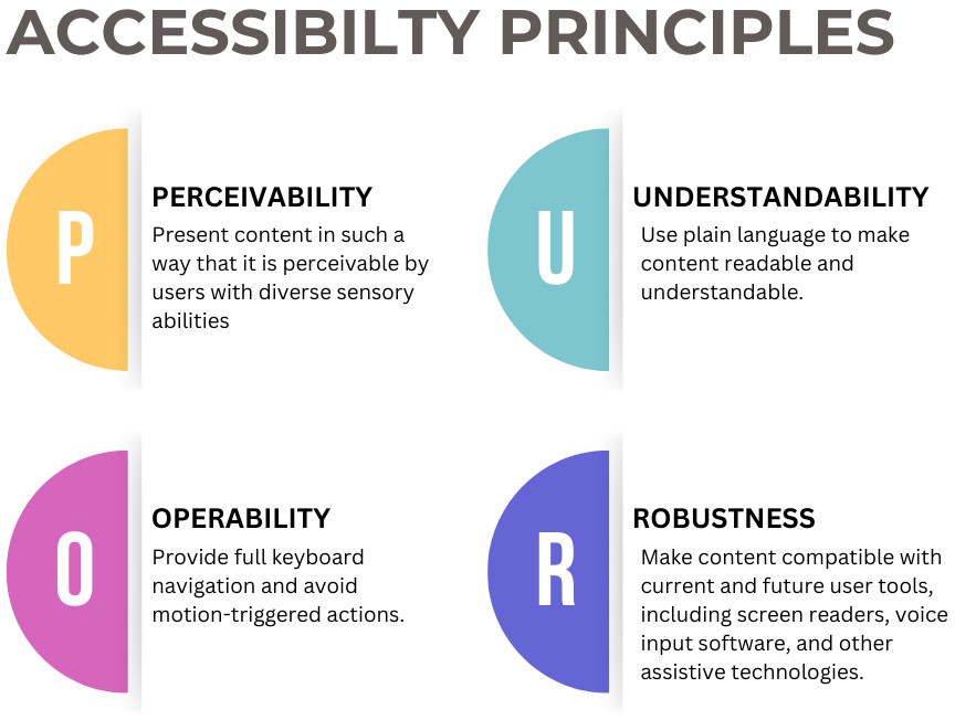 Developers should follow these design principles, often abbreviated as POUR: Perceivability, Operability, Understandability, and Robustness, when designing accessible software.