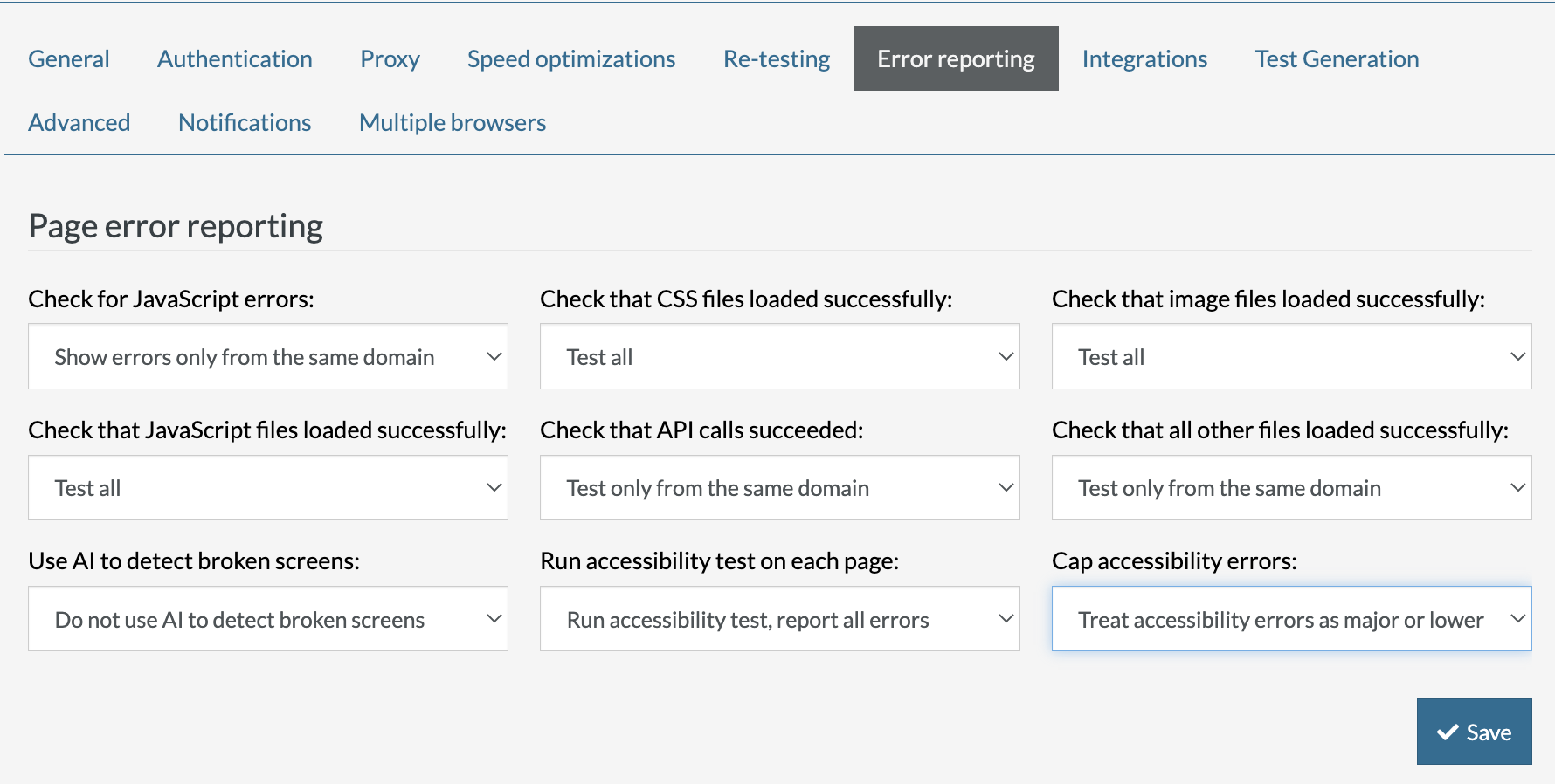 You can turn on Run accessibility test on each page in Settings, then select Cap accessibility errors to the maximum error level you want to have accessibility errors reported. Once enabled, testRigor will run all accessibility tests on each page during test runs.