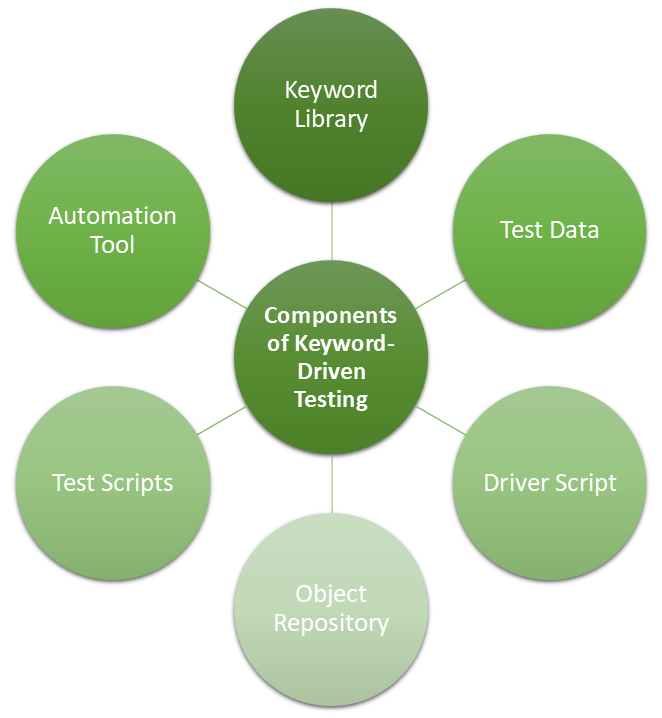 Based on the tools you use, the components may vary. However, the major components that comprise keyword-driven testing are: