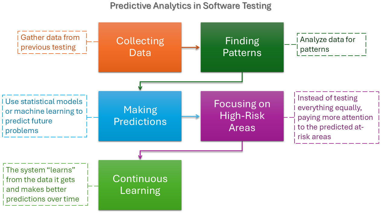 In software testing, predictive analytics works in a similar way. It looks at past data from tests, bug reports, and other sources to predict where problems might happen in the future. This helps testing teams focus on the areas that are most likely to have issues, rather than testing everything randomly. It’s a smarter, more efficient way to test software.
