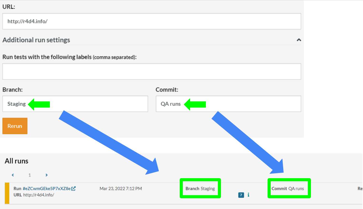 - It also can be done through the UI on the new “Additional run settings” section in the “Test Suite Details” Section. Separate runs for specific labels (and branch/commit runs too) are created in the “All Runs” Section. They WILL NOT modify the status of the main last run.