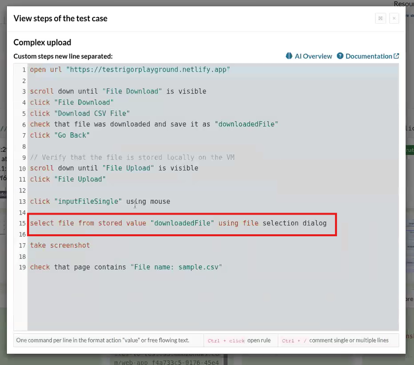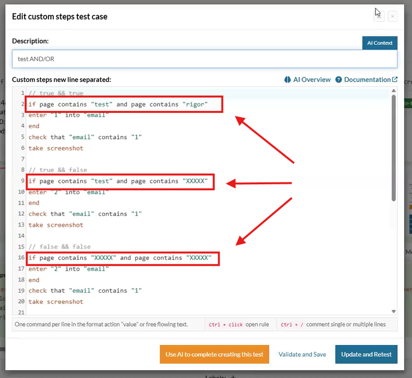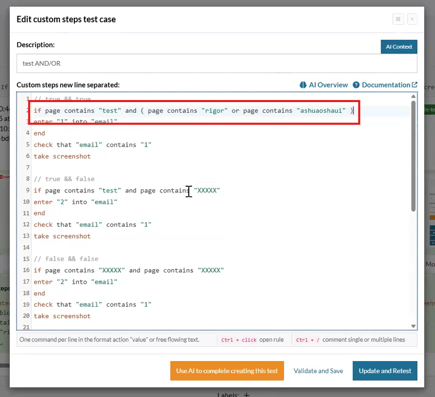 Additionally, the feature supports bracketed expressions, allowing for precise grouping and evaluation order of multiple conditions. This powerful logic capability allows for sophisticated test flows, ensuring that composite validations reflect real-world scenarios more accurately and improve test case flexibility and robustness.