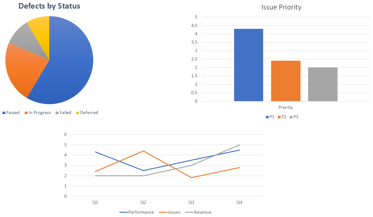 - Include visuals: Visual elements like charts, graphs, and tables can help convey information more effectively. Use visuals to represent test case results, defect trends and other data.