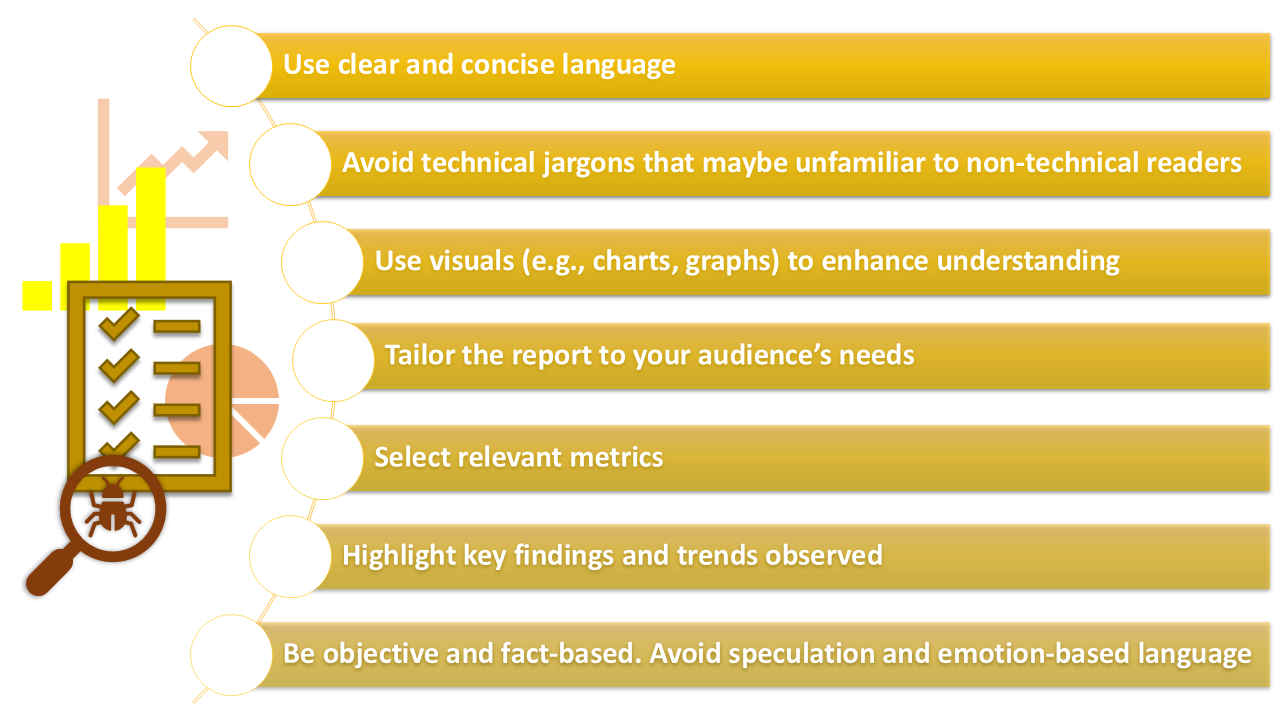 - Understand your target audience: Know who will be reading the report. Tailor the content and level of detail to match your audience’s needs and technical expertise. Non-technical stakeholders may require a high-level summary, while technical team members may need more detailed information.
