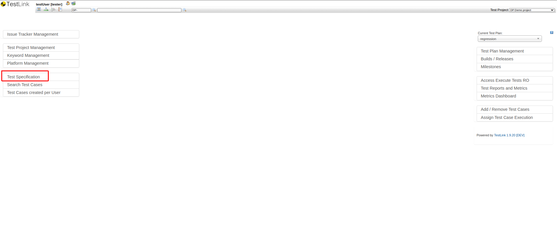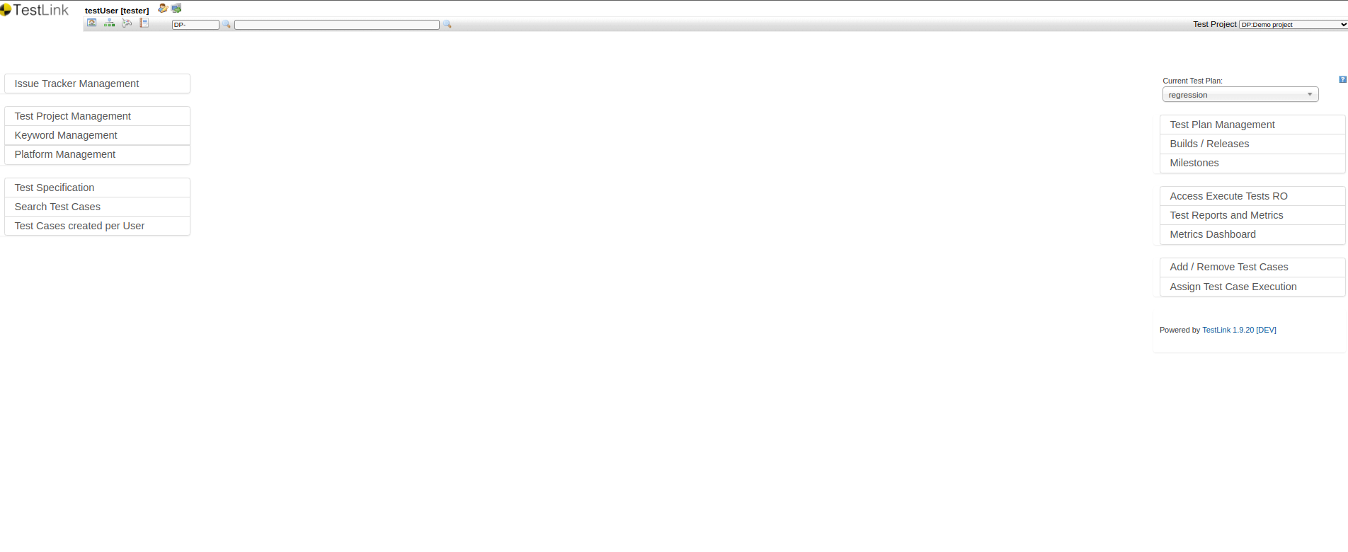 Once you log in to TestLink, the home page will display different options. On the left side, you can see project-related options. On the right side, you can see options for adding test cases, plans, milestones, etc. All these options vary depending on the role set by the lead or project administrator.