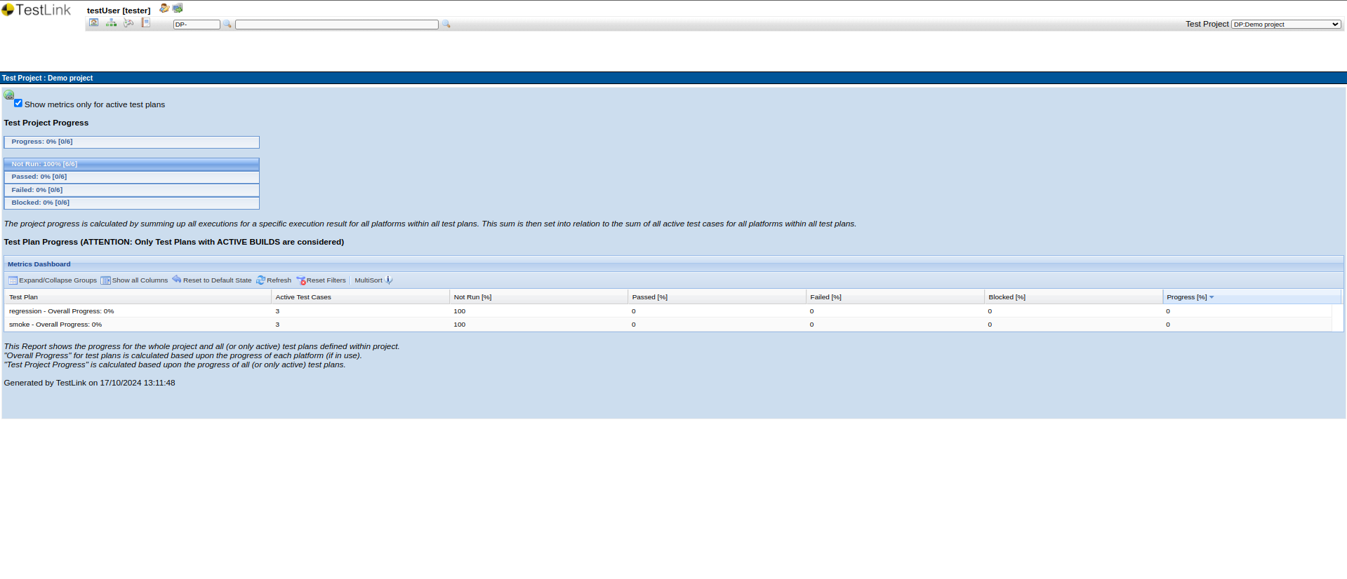 TestLink dashboard provides a detailed information about the test execution. You can see the test cases for each Test Plan and their execution status.