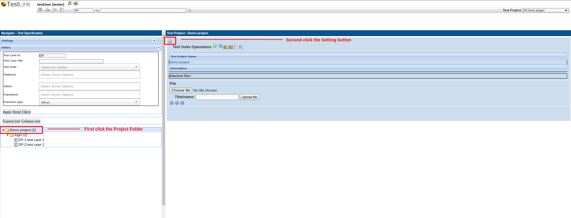 Step 2: On the Test Specification page, you can see the project folder structure. Click on the root folder, which will have the Test Project Name. The project details will be displayed on the page. Click on the Setting button at the top.
