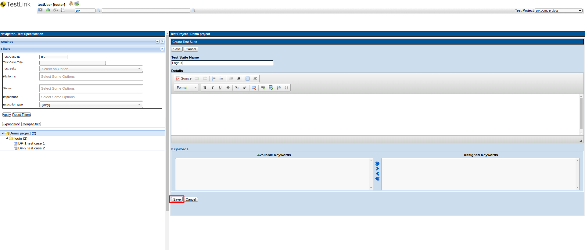 Step 4: Enter the Test Suite Name and click Save. A New Test Suite will be created.