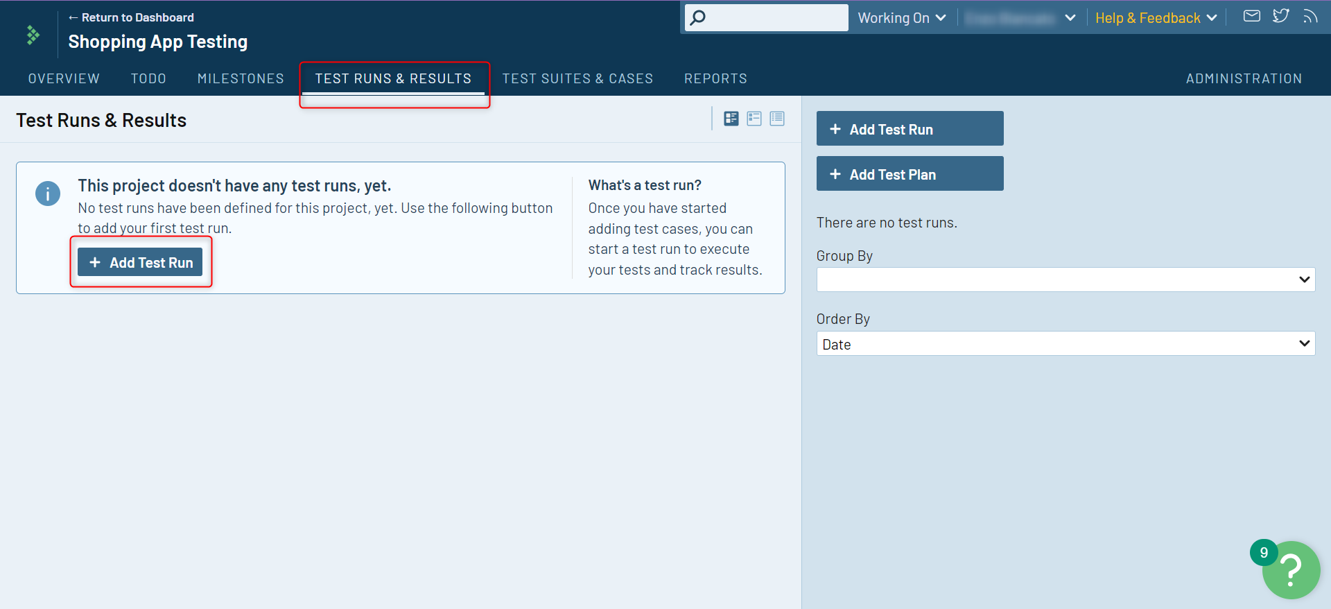 So far, you have a project that contains test suites, and each of these test suites contains test cases. Now, you need to create test runs that will help you track test executions.