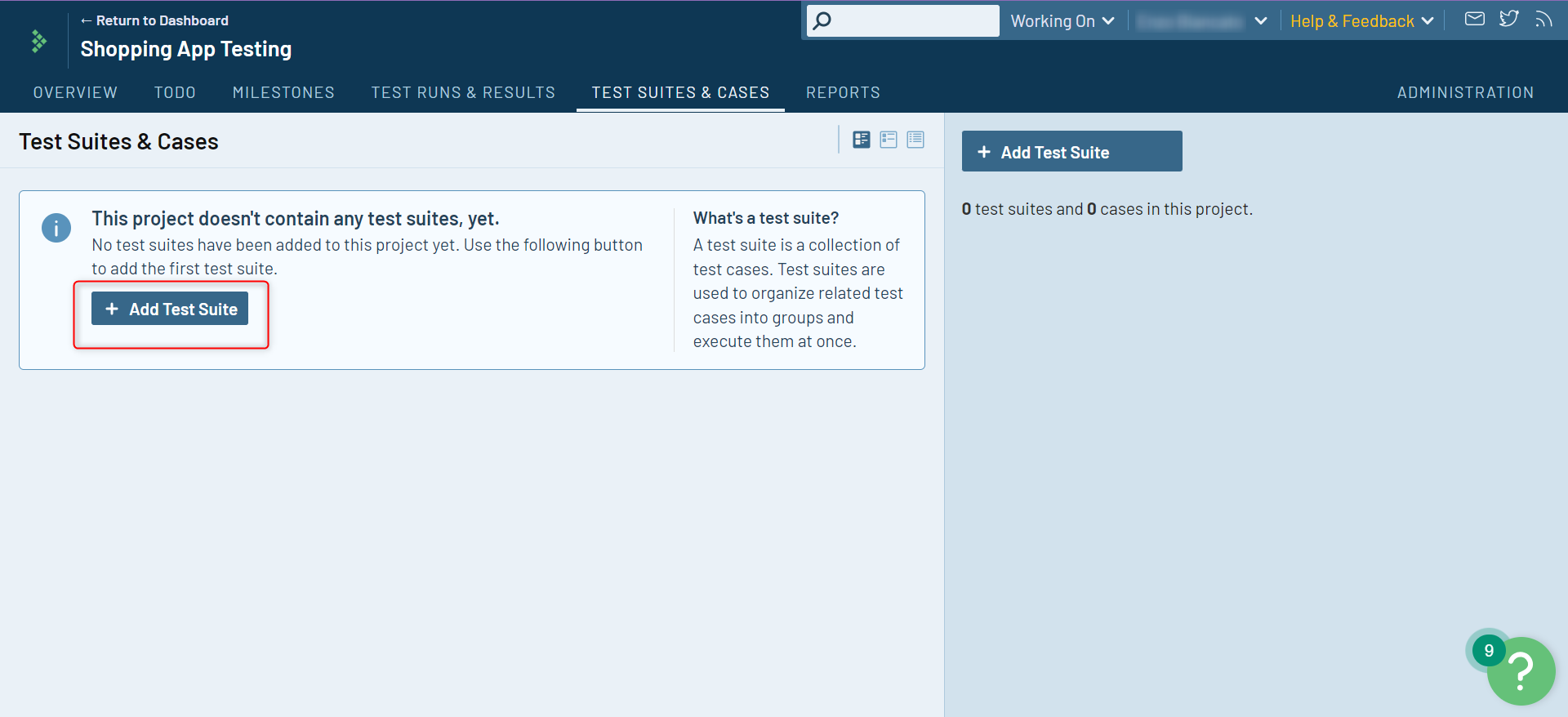 Step 1: To add test suites to a project, you can do so by going to the Dashboard, where your project is listed. There are a couple of options, one of which is to add test suites.