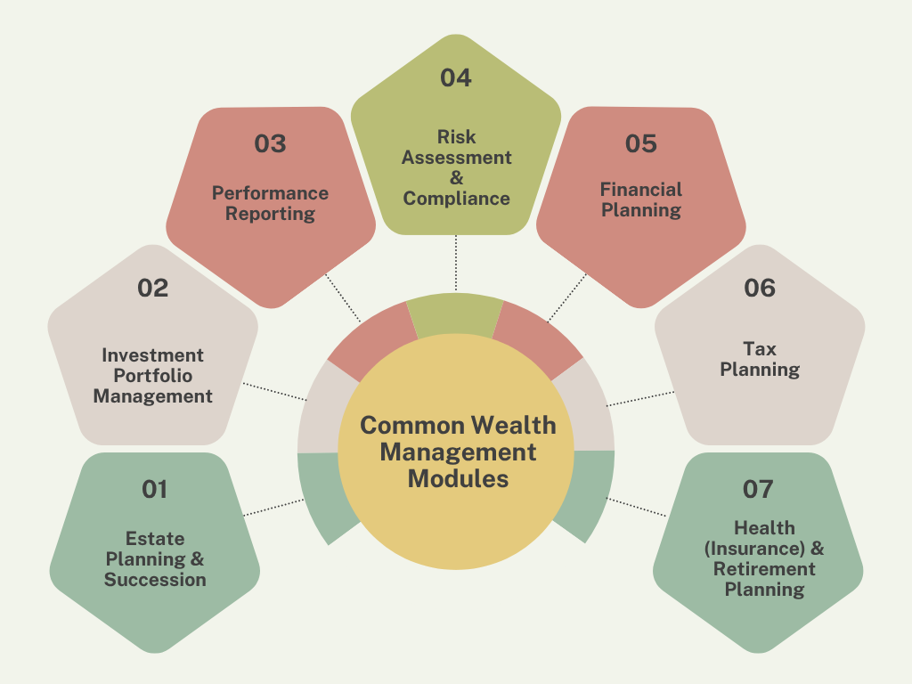 • Wealth management focuses on managing various financial assets that people own. It includes investment management, tax planning, financial planning, estate planning and succession, insurance, and retirement planning.