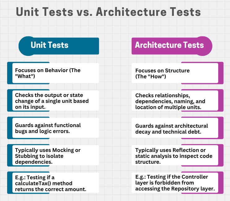 | Unit Tests | Does this method return the correct value? | Architecture Tests check the allowed relationships between classes. |