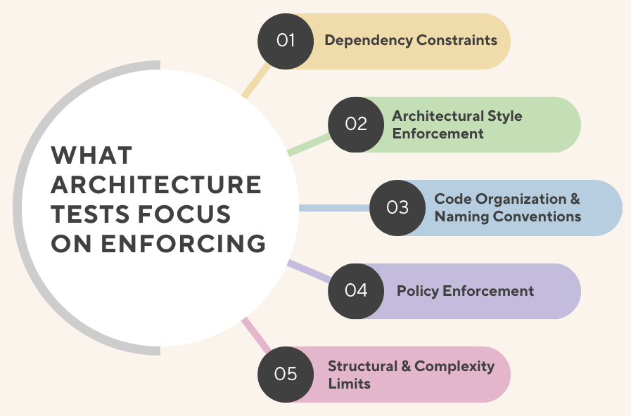Consider architecture tests as a way to ensure your design assumptions are checked automatically. This means that your codebase always complies with the structural assumptions that you intended since before code creation. These tests act as automated stockaders, ensuring that the framework does not deteriorate with time.