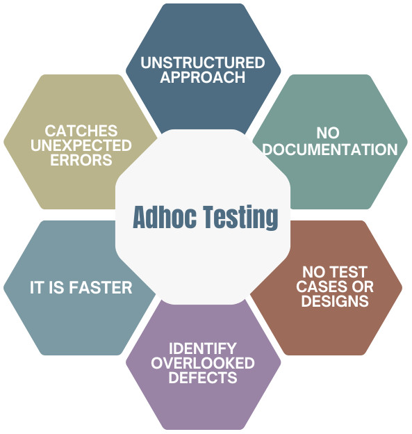 - Ad hoc identifies unpredictable crashes, unexpected bugs, and defects.