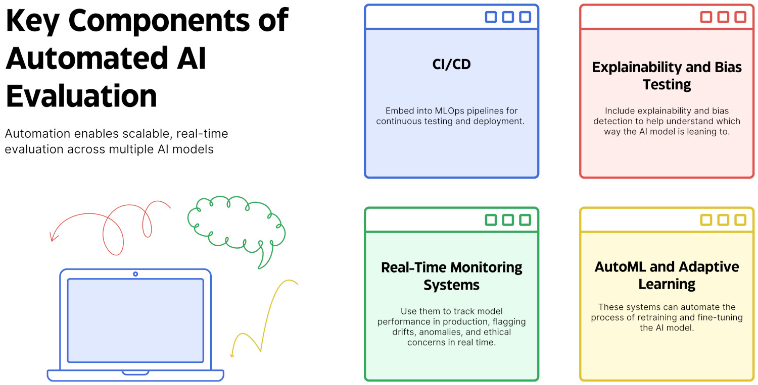 • To automate AI evaluation, use tools that can help you with CI/CD, explainability in AI, real-time monitoring, AutoML, and adaptive learning. However, be wary of trying to automate everything, as human feedback is equally important.