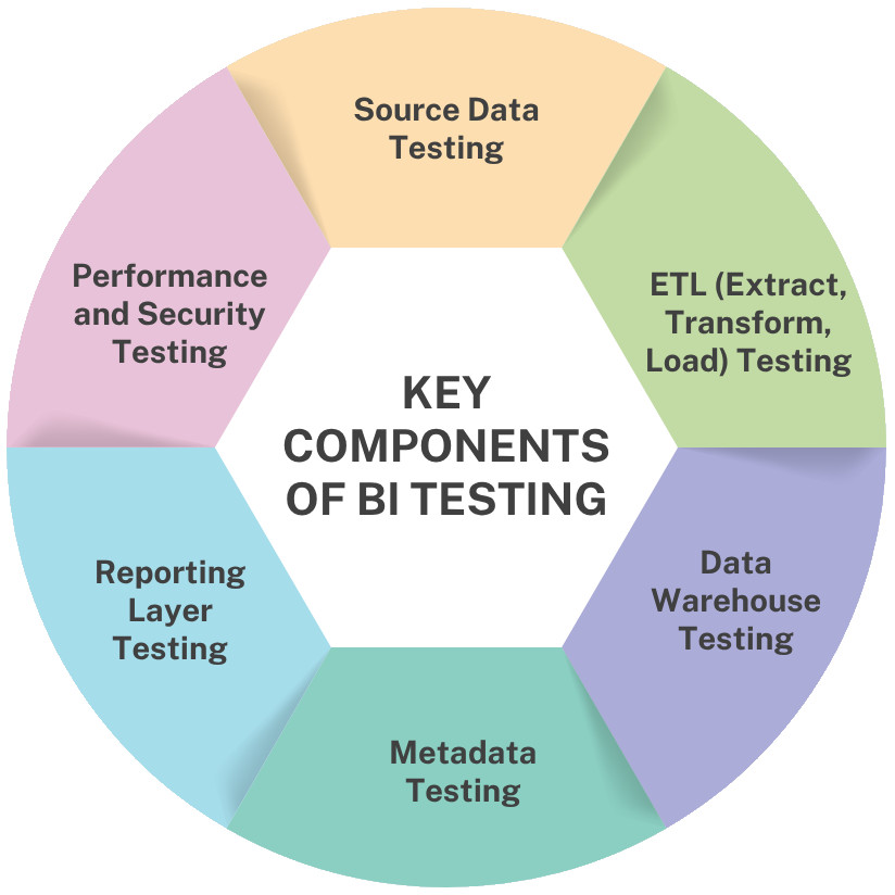 BI testing contains several critical elements that function together to promote a true, reliable, and effective business intelligence application. It is split into components, each targeting a particular part of the data lifecycle. Starting from validating source data and ETL processes, through to testing the final output in production databases, as well as more static lower environments.