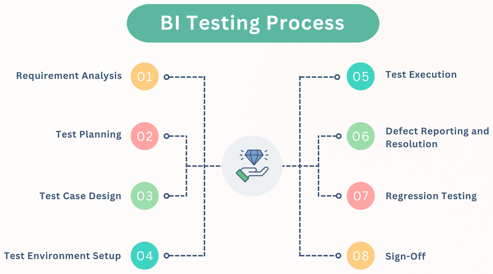 The BI testing process outlines the structured approach used to validate the accuracy, performance, and reliability of Business Intelligence systems. It ensures that every stage — from requirement analysis to final sign-off is systematically tested to deliver trustworthy and high-quality data for decision-making.