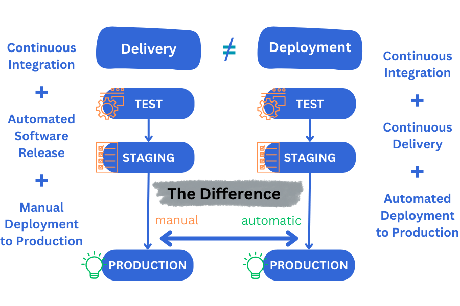 - Deliver: This is an automated stage where the approved code is sent to the production environment. It is carried out with the developer’s approval in continuous delivery and sans human intervention in continuous deployment.