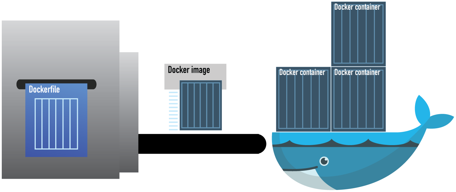The contents of the container are declared in “Dockerfile” (similar to Vagrantfile, Makefile, etc.). When Dockerfile is built, it produces a “Docker image” which can be started to create a “Docker container.”