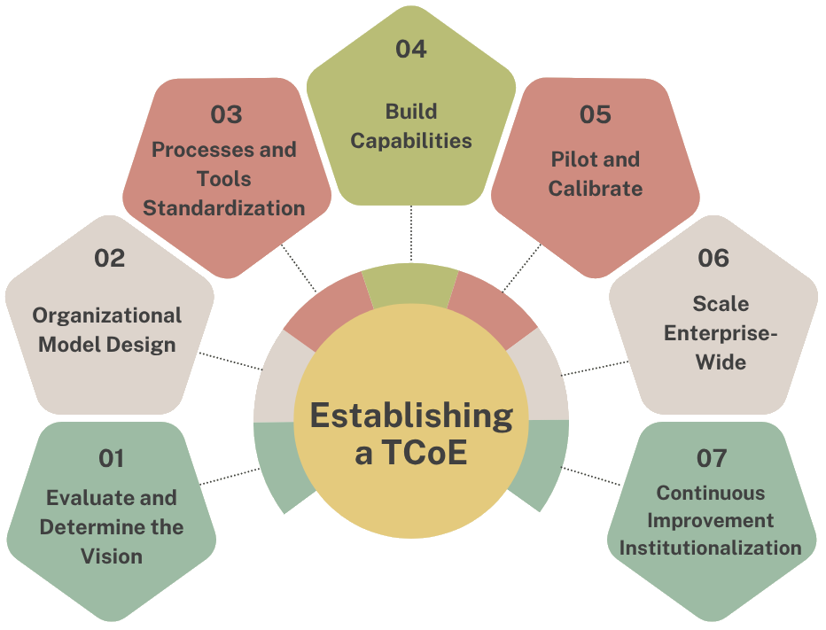 • Step 7: Continuous Improvement Institutionalization: Transform the processes into dynamic learning. Introduce data-driven perspectives and AI-based insights to make the TCoE self-adaptive.