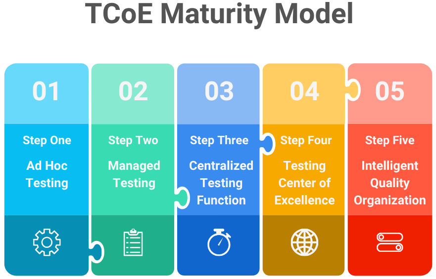 • Stage 4: Testing Center of Excellence: The organization creates a fully functioning TCoE, central governance, common assets, automation frameworks, and enterprise-wide metrics, creating uniform results.