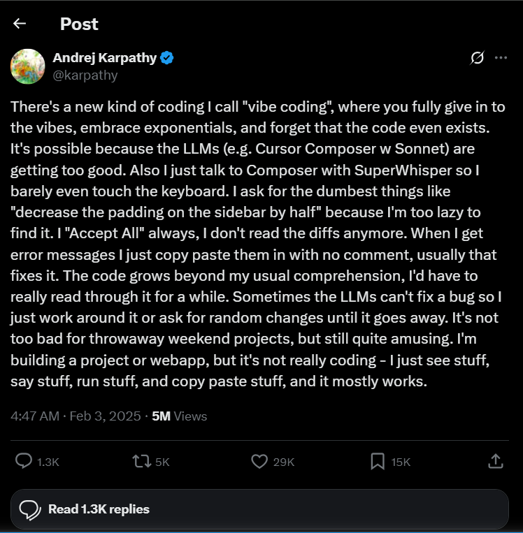 You can do a lot more with Artificial Intelligence (AI) besides asking general knowledge questions. AI can write code for you. Vibe coding is like doing pair programming with AI. If you are one of the many tech-savvy people who are always looking out for what’s new in the tech world, then you must be familiar with this new trend already. Andrej Karpathy (co-founder at OpenAI and former AI leader at Tesla) coined this term on his X account earlier in 2025.