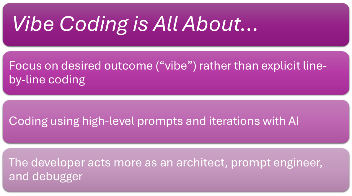 • Vibe coding allows developers (and even non-developers) to build applications by describing what they want in natural language rather than writing every line of code. This technique is a way of abstracting the coding process – focusing on the intent of the application rather than its implementation (code).