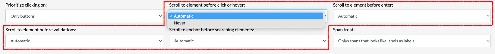 testRigor uses a logic that automatically scroll targeted elements to the center of the screen. This applies to elements targeted in click or hover commands, input fields targeted in enter commands, elements targeted in validations, and anchors used to refer to any other element. When used, anchors have the highest priority for automatic scrolling.