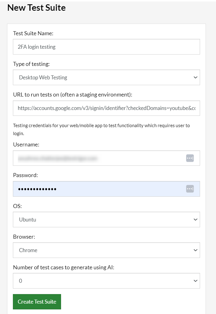 - Testing credentials for your web/mobile app to test functionality which requires user to login: You can provide the app’s user login credentials here and need not write them separately in the test steps then. The login functionality will be taken care of automatically using the keyword login. However, this is an optional field and can be skipped if not relevant.