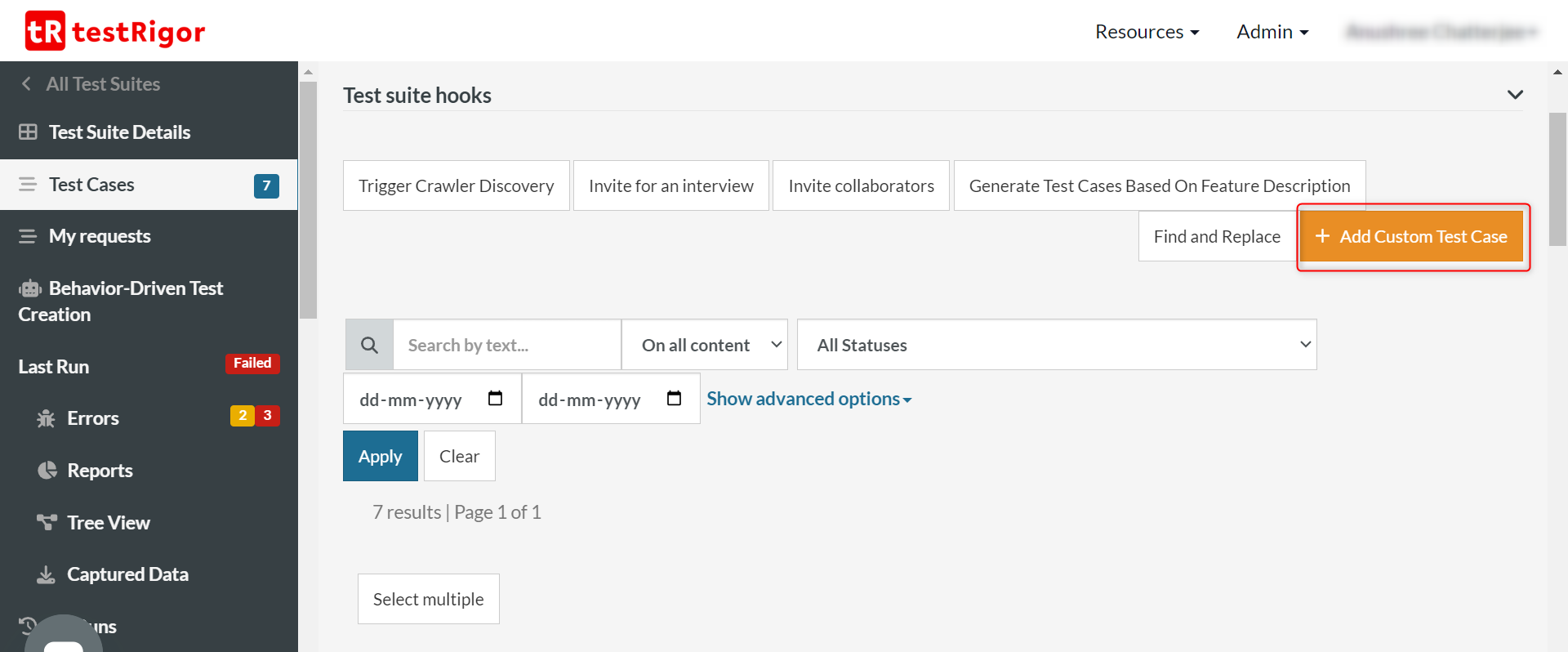 Step 5: To create a new custom test case, click Add Custom Test Case.