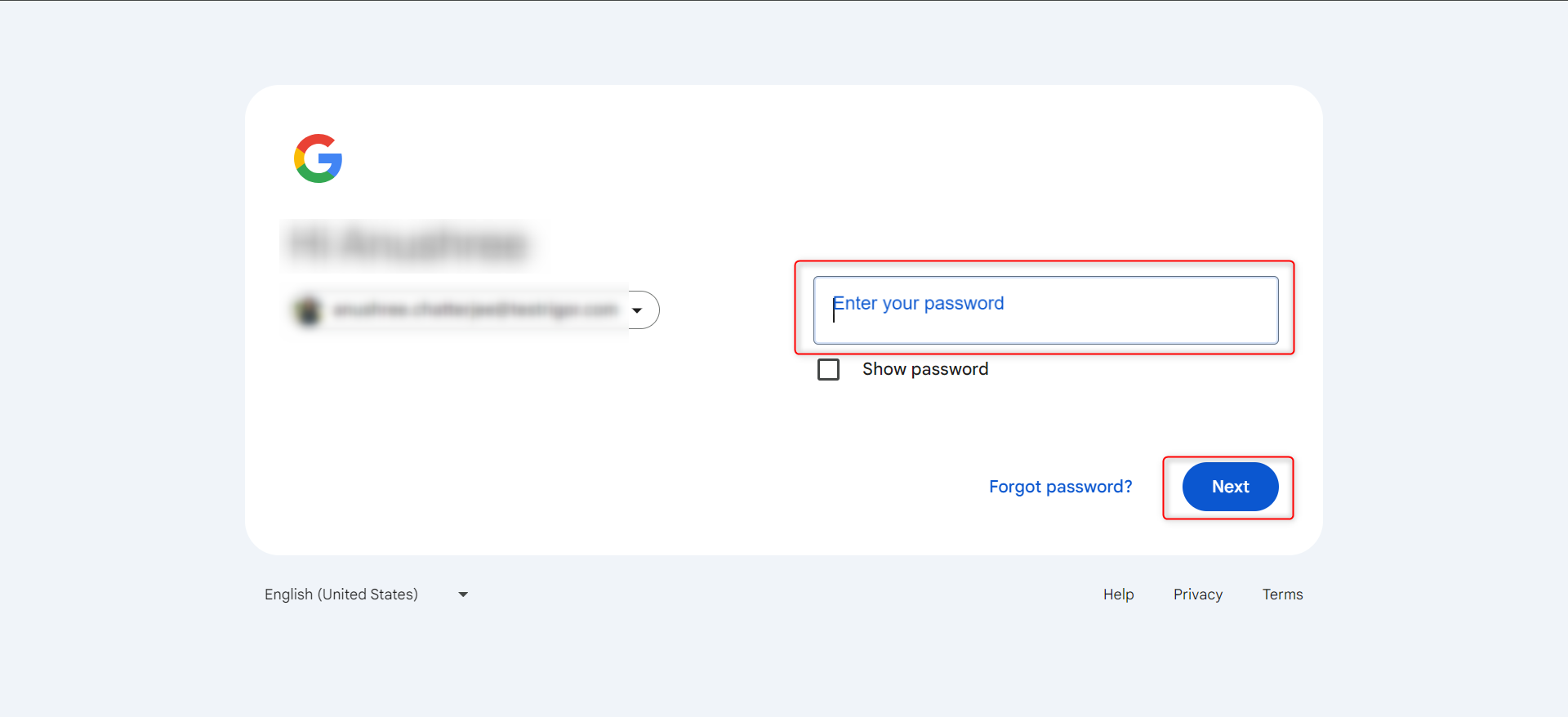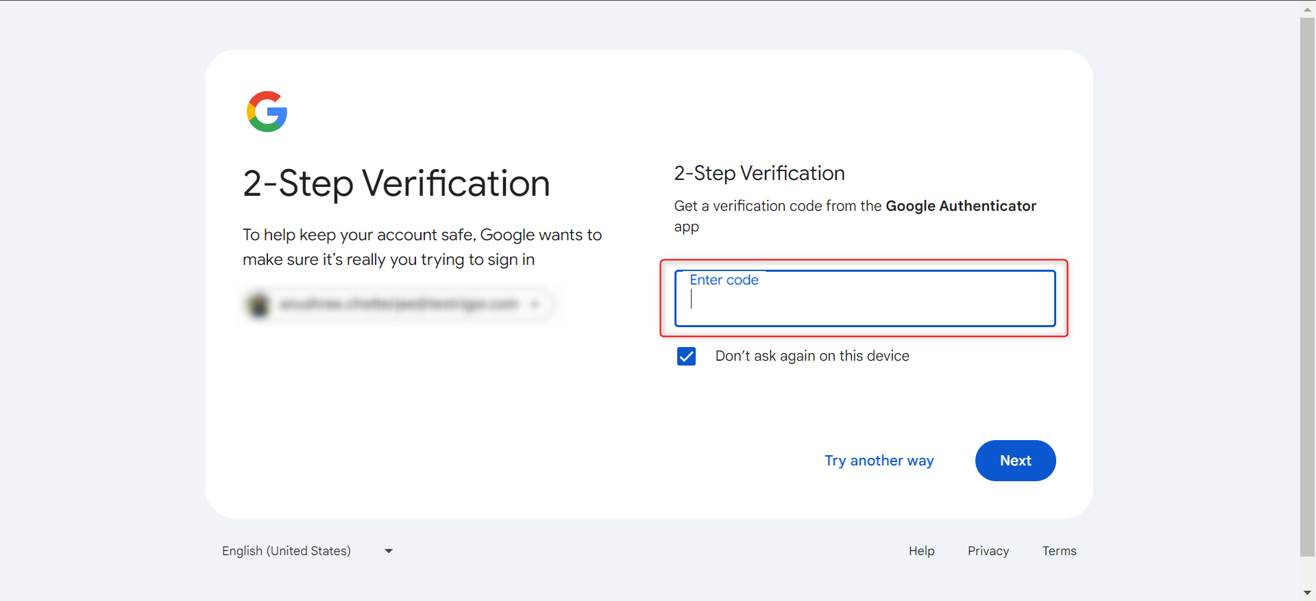 enter stored value "test-gmail" into "Email or Phone" click "Next" enter stored value "test-gmail-pass" into "Password" click "Next" generate PIN with google authenticator from stored value "MyQrCode" and save as "code" enter stored value "code" into "Enter code"