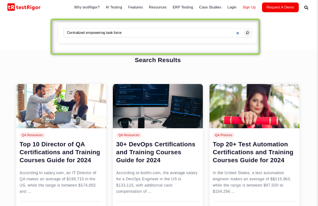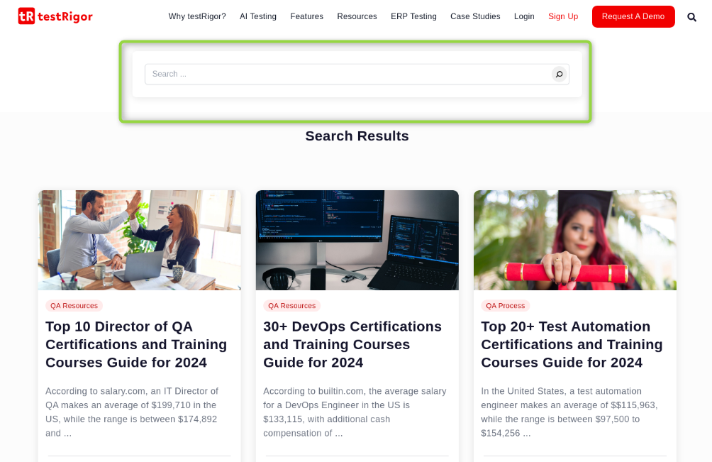 The below test case involves going to testRigor’s home page and searching a string through the search bar. The string to be searched will be fetched using an API call.
