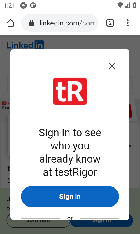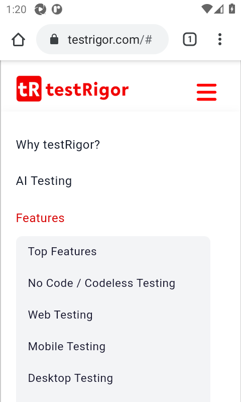 lick on "menu" click on "Features" below "AI Testing" click on "Top Features" scroll down click on "LinkedIn" check that url contains "linkedin.com" go back