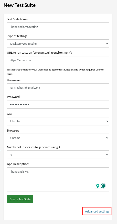 - Testing credentials for your web/mobile app to test functionality which requires user to login: You can provide the app’s user login credentials here and need not write them separately in the test steps then. The login functionality will be taken care of automatically using the keyword login. However, this is an optional field and can be skipped if not relevant.