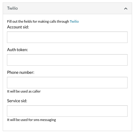 Step 4: Click the Integrations dropdown, select Twilio, and add the details mentioned. To add these details, you should set up an account with Twilio. Once you complete the account setup with Twilio, you can add the following information by visiting the Twilio console page.