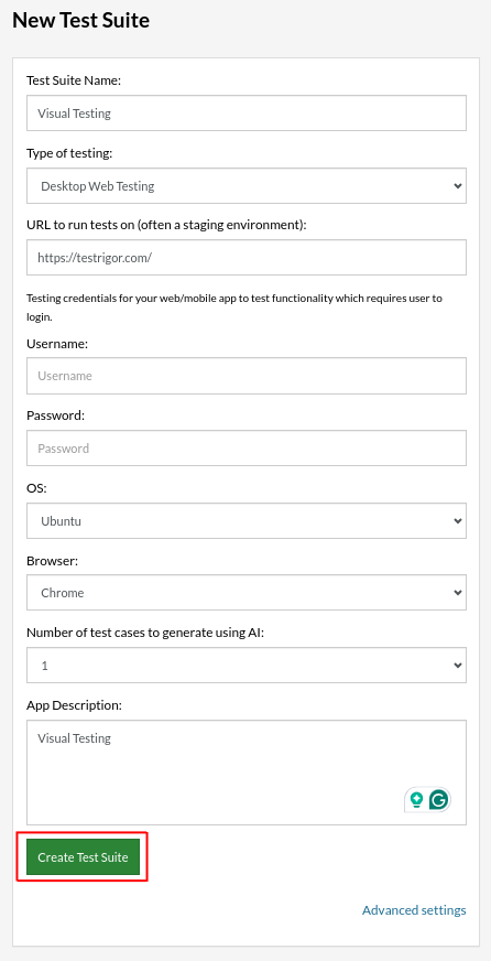 • Testing credentials for your web/mobile app to test functionality which requires user to login: You can provide the app’s user login credentials here and need not write them separately in the test steps then. The login functionality will be taken care of automatically using the keyword login. However, this is an optional field and can be skipped if not relevant.