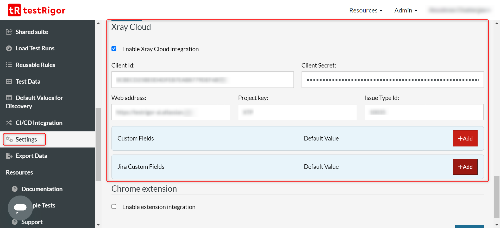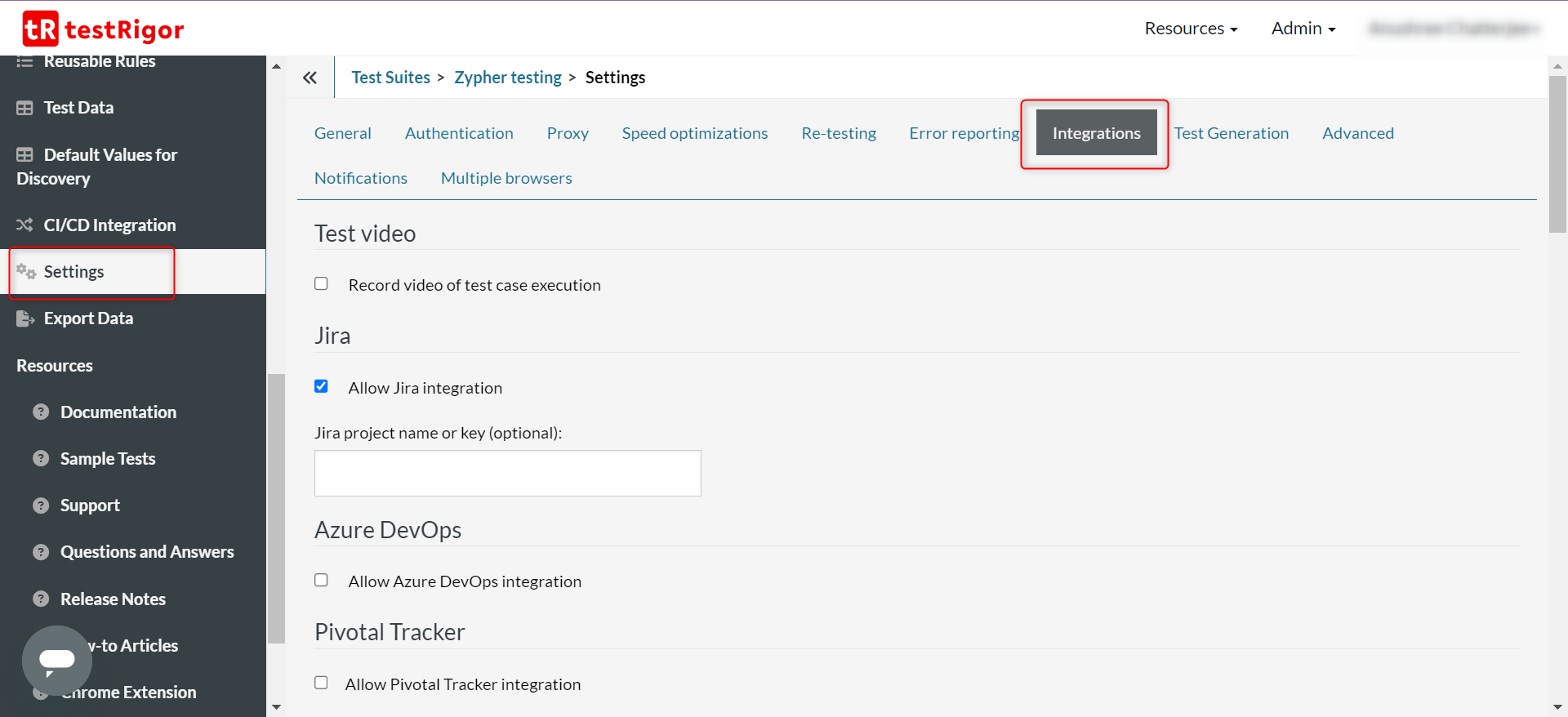 Step 2: Within the test suite, navigate to the Settings -> Integrations -> XRay section.