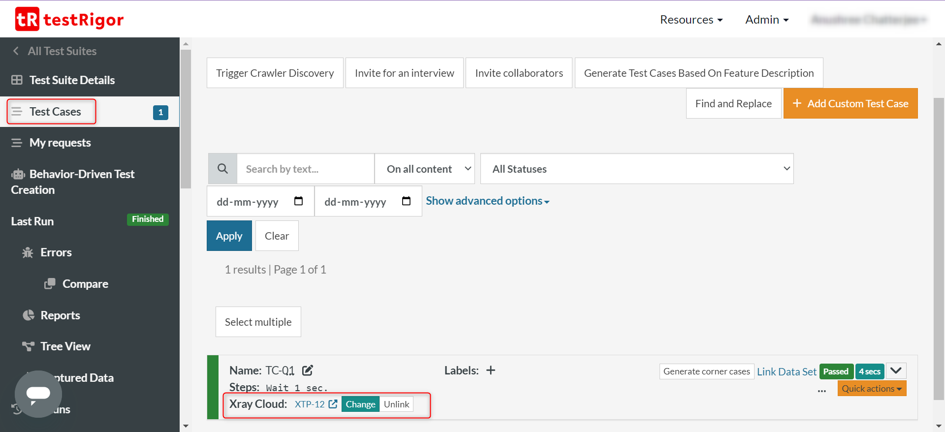 Step 3.1: You will see a new section associated with each testRigor test case, as shown below, called Xray Cloud. To link a testRigor test case to one of the XRay test cases, click Change.