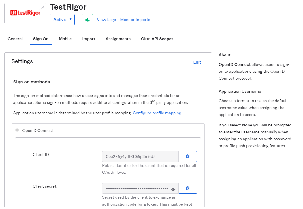 Note: These values allow testRigor to communicate with Okta. The Client ID is a public identifier for the client that is required for all OAuth/OIDC flows. The Client Secret is a private identifier which you should not share or broadly distribute. - Before leaving Okta, ensure you have given yourself and any other target users access to the testRigor application. You can do this by going to Applications > testRigor > Assignments tab and then assigning to either the target people or group.