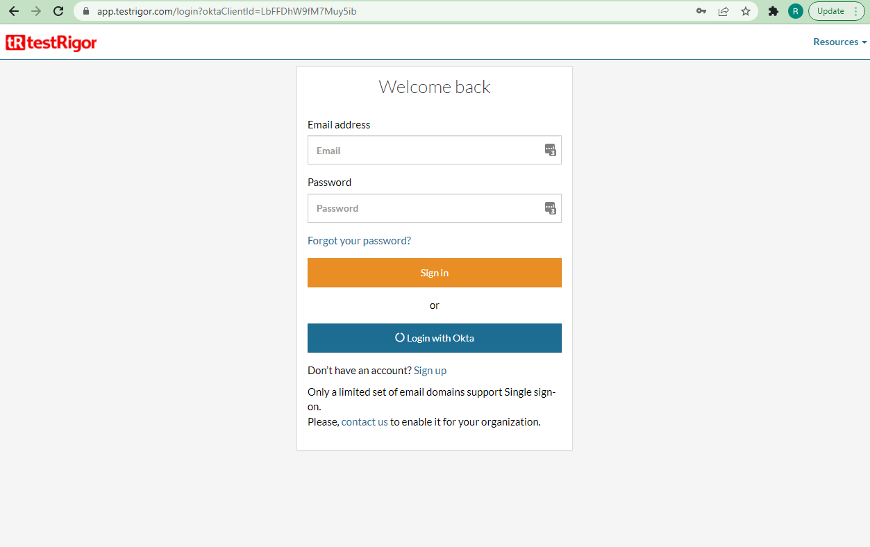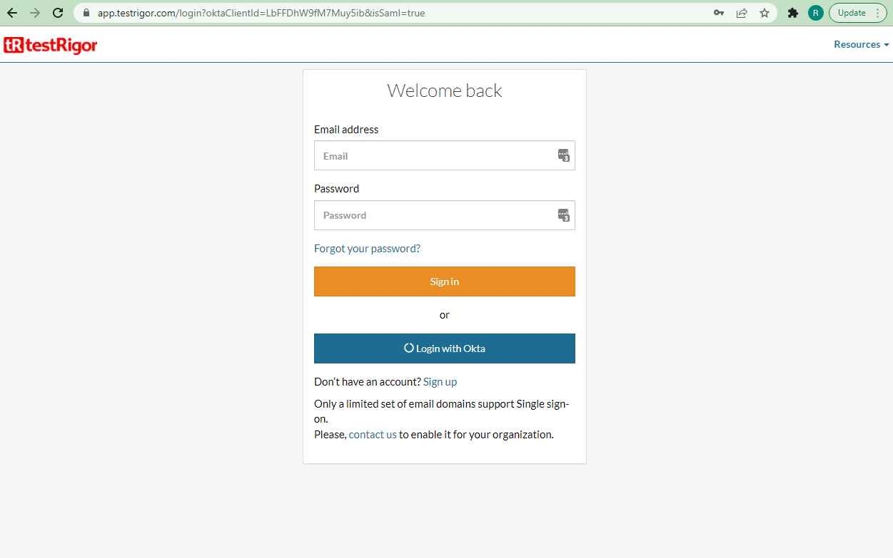 After that, in the testRigor login’s page, you can click on “Login with Okta”.
