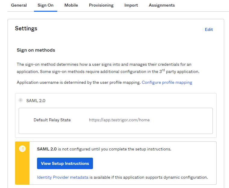 Today testRigor support the integration with Okta through OIDC and SAML. The following documents the configurations for setting up integration between testRigor and Okta separated by protocol (OIDC or SAML). Okta is the Identity Provider (IDP) and depending on the use case, the user will be redirected to Okta for authentication if no session has been established. To configure your provisioning settings for testRigor in Okta, there are two main steps to follow: