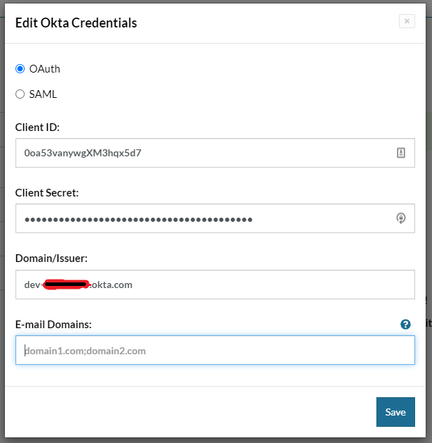In the form which will appear, select OAuth, enter the Client ID, Client Secret and Domain/Issuer.