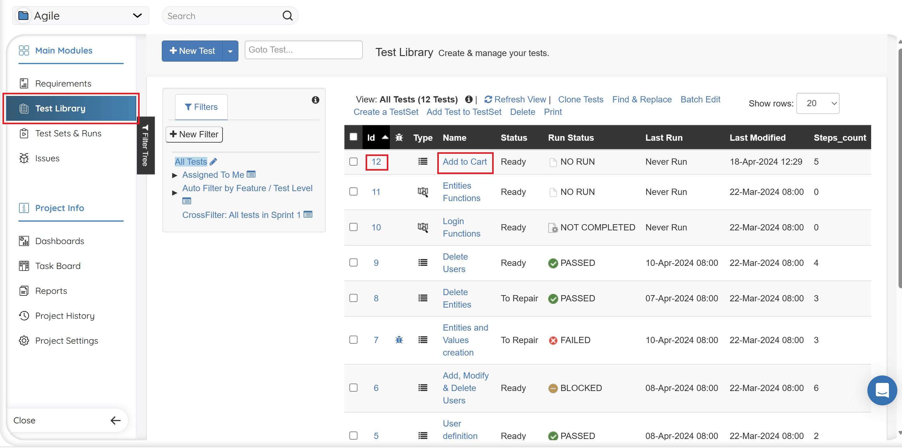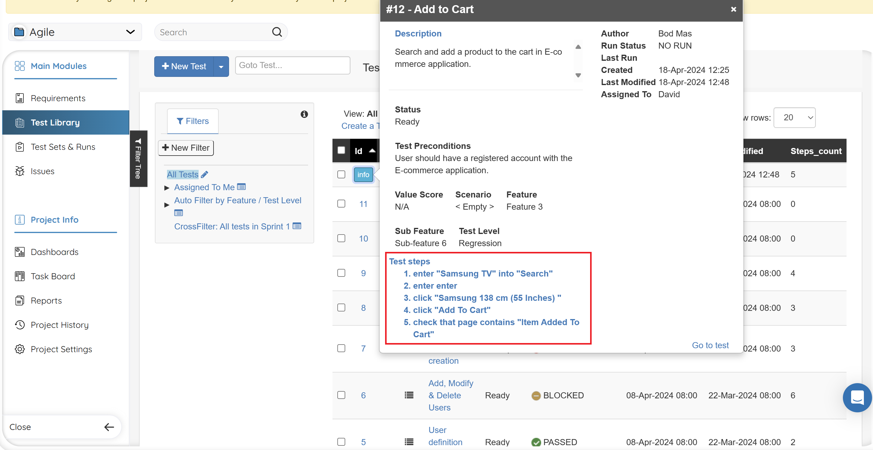 Step 3: Click on the test case Id (12 in this example), to view the test steps. Copy the test steps.