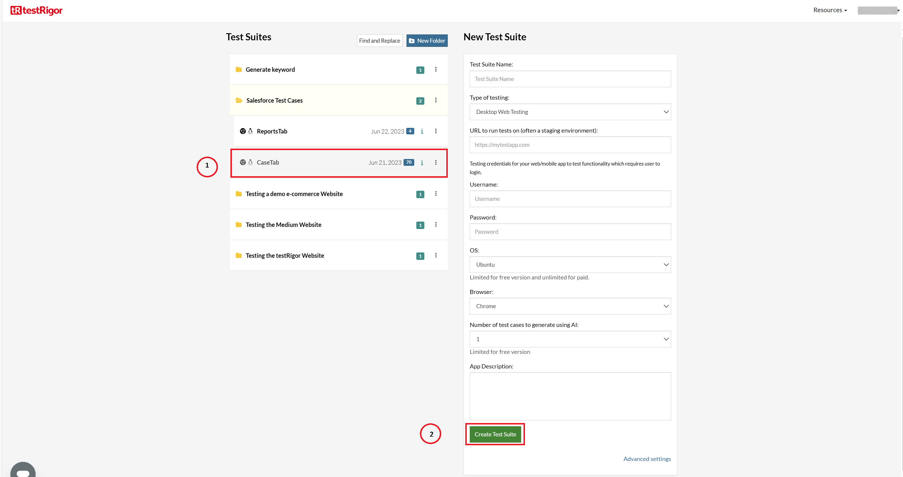 Option 2: Otherwise, create a new test suite if you do not have any. Enter the below information while creating a new test suite: