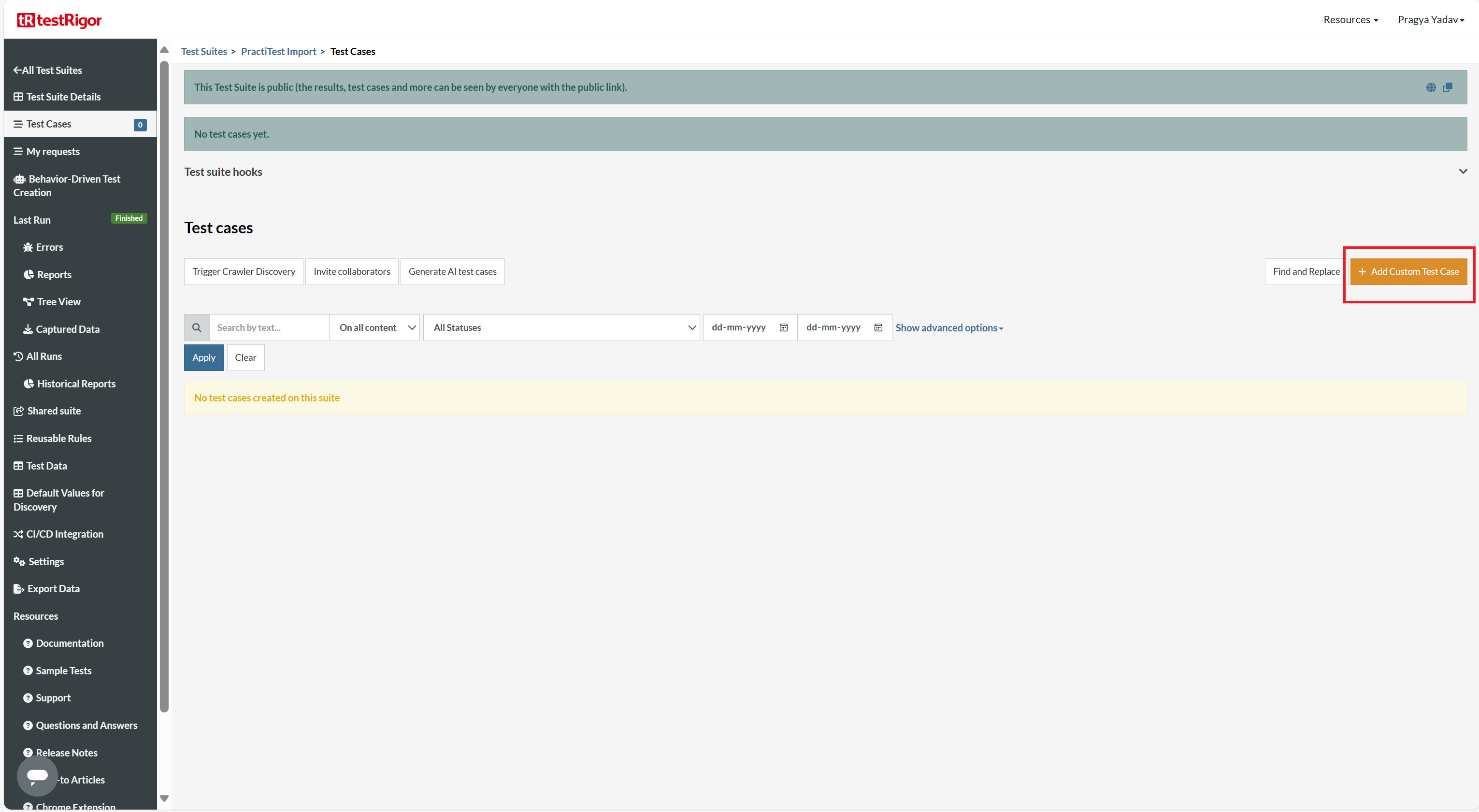 Option 1: If you have created test suites, click the test suite where you want to import test cases from PractiTest. You will navigate to the testRigor’s Test Cases screen.
