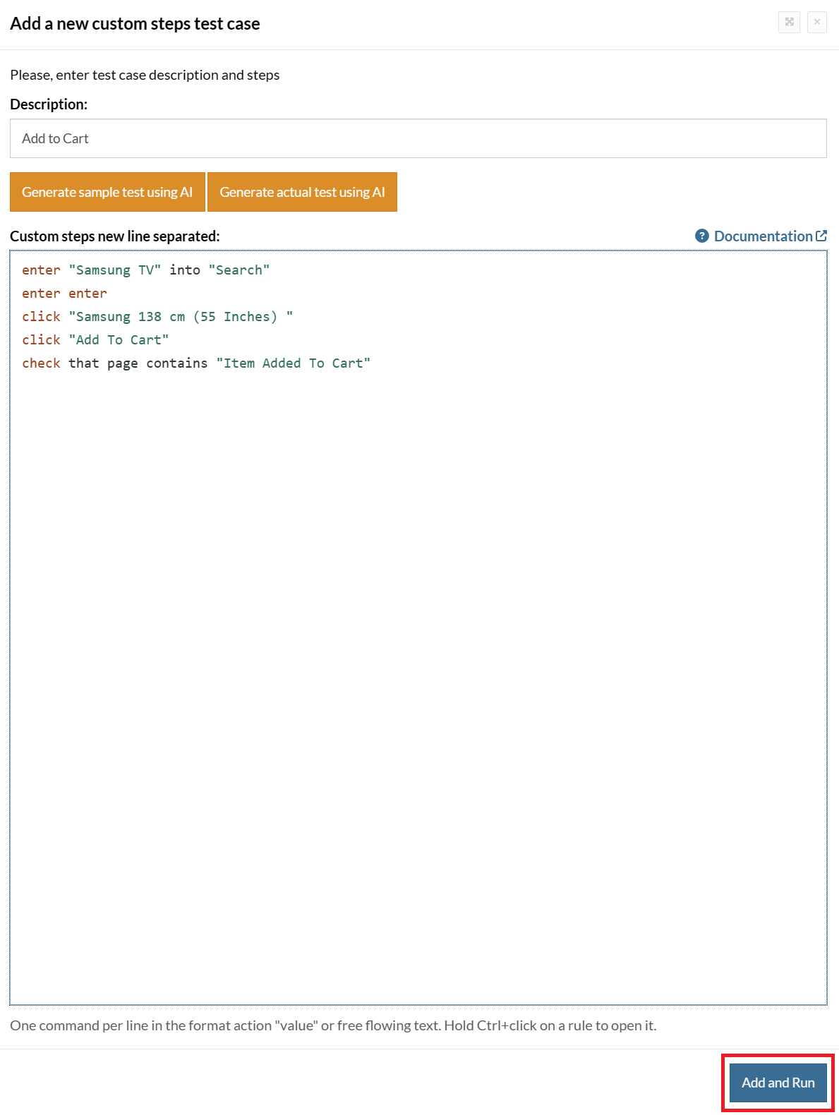 Step 6: Provide the test case Description. Paste the copied test case steps into the custom steps section. Click Add and Run.