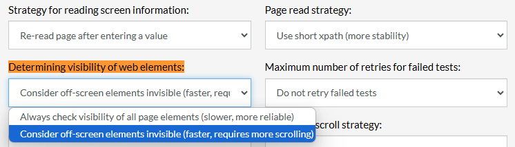 New: “Consider off-screen elements invisible (faster, requires more scrolling)”.